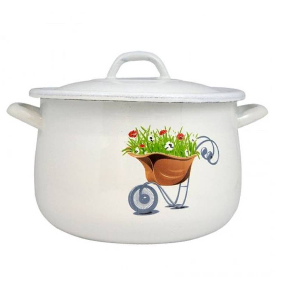 Cratita emailata bombata alba cu model, Diametru 24cm, cu capac