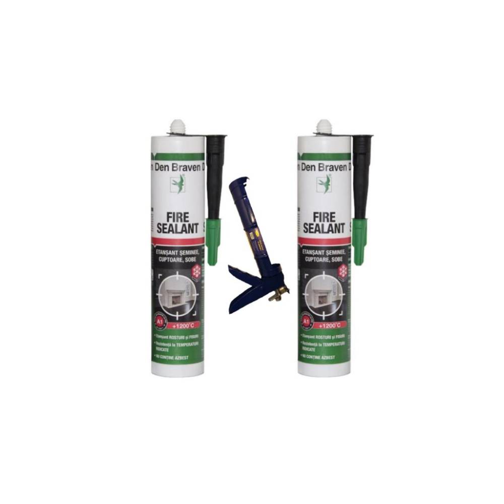 Etansant Den Braven Fire Sealant, negru, rezistent la temperatura, 280 ml x 2 + 1 bucata Pistol silicon din metal, albastru