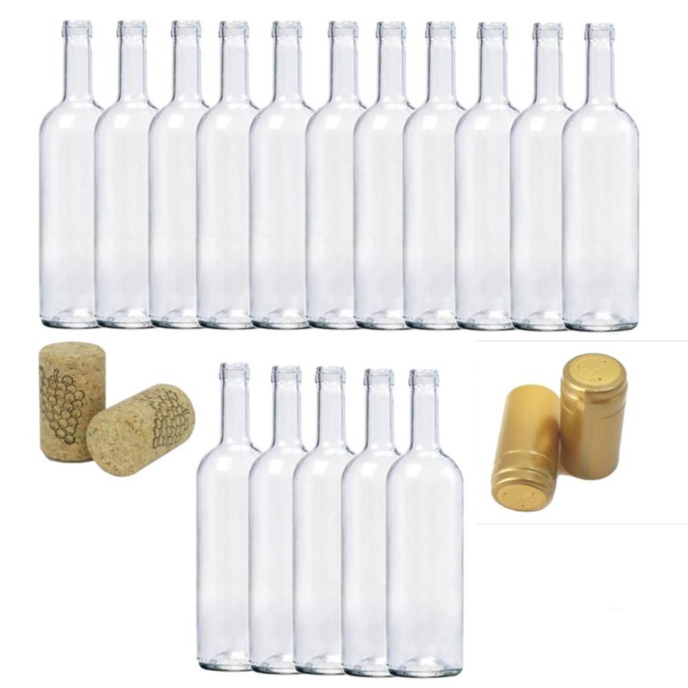 Sticle pentru vin 750 ml cu dopuri de pluta si capisoane aurii, 16 buc/set
